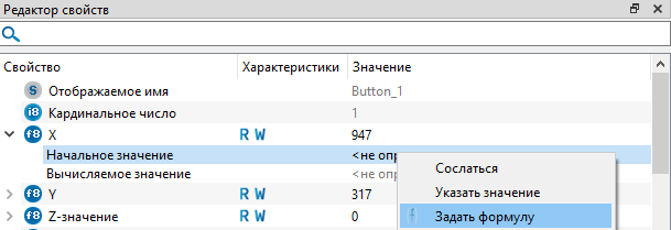 Начальное значение свойства может быть указано в виде формулы. Формула может состоять из одного или нескольких параметров инициализации объектов и/или строк. Чтобы начальное значение задать в виде формулы, в контекстном меню выберите команду Задать формулу и укажите нужную формулу.