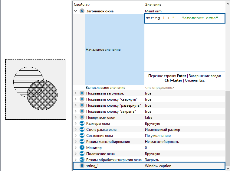 В примере ниже показано, как в заголовок окна формы выводится формула, состоящая из параметра инициализации типа string и строкового значения Заголовок окна: