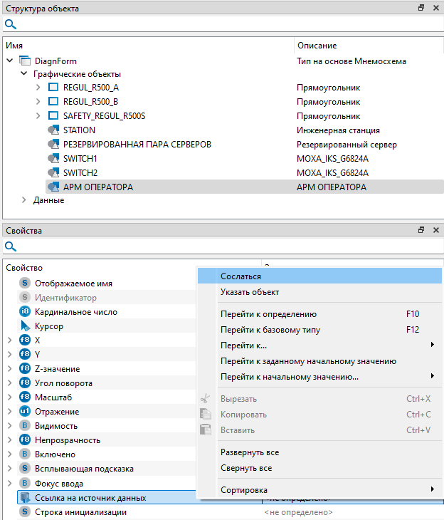 Ссылка на источник объекта – кликните правой кнопкой мыши по свойству и выберите из контекстного меню команду "Cослаться". Укажите путь к элементу "MAIN_SOURCE" из глобального объекта "Connections": unit.Connections.MAIN_SOURCE.