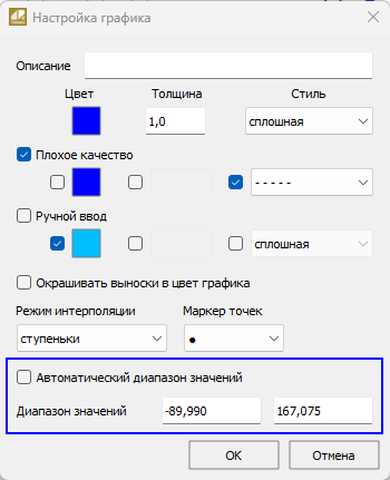 Чтобы на графике отображался нужный диапазон значений, необходимо отключить Индивидуальный масштаб и включить Фиксированный диапазон значений.