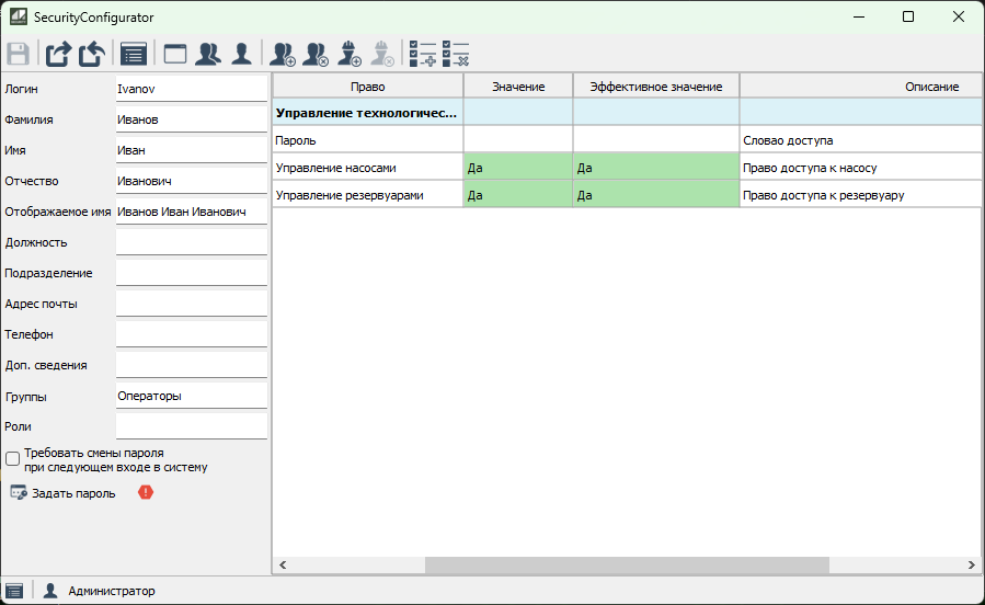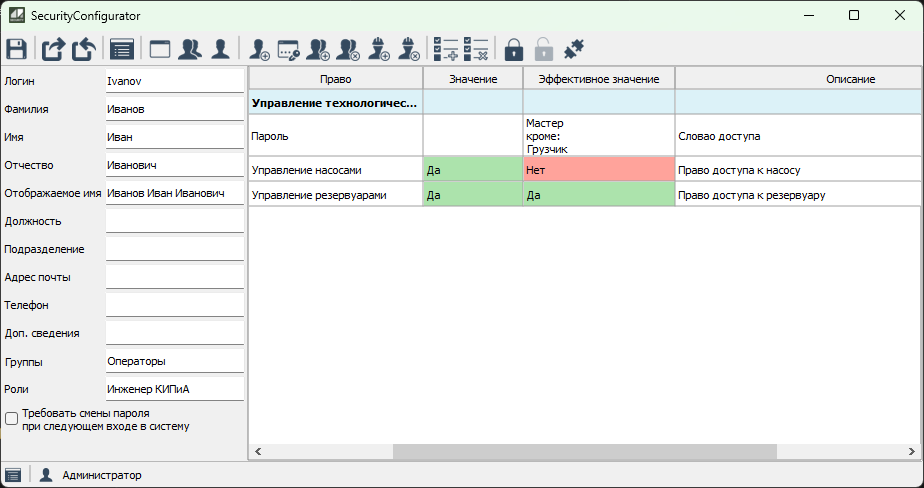 Значение права для пользователя зависит от того, в каких группах он состоит, какие роли ему назначены, и какое значение права назначено пользователю лично. Итоговое значение называется эффективным значением права.