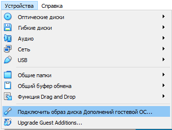 1. Зайдите в меню "Устройства" и выберите "Подключить образ диска Дополнений гостевой ОС...".