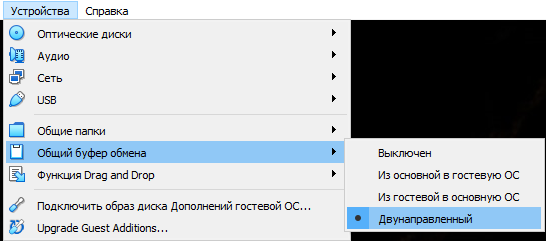 7. Включите буфер обмена. Для этого зайдите в меню "Устройства" → "Общий буфер обмена" и выберите "Двунаправленный".
