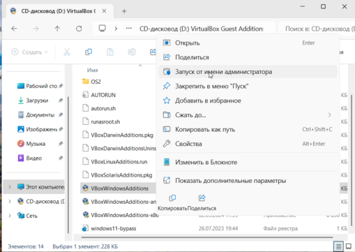 3. Откройте диск гостевых дополнений и запустите приложение "VBoxWindowsAdditions" от имени администратора.