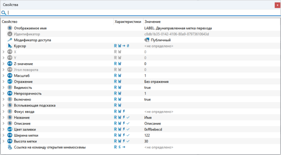 Данный тип предназначен для организации метки перехода между мнемосхемами. При помощи свойств мнемосимвола можно управлять размерами метки, а также задавать пользовательское название и описание метки перехода.