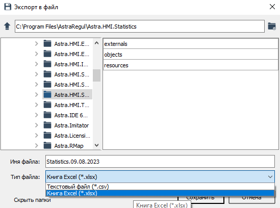 Чтобы сохранить таблицу параметров статистики, добавленных в область просмотра, нажмите кнопку "Экспорт в файл". Укажите путь сохранения файла, задайте имя и выберите формат для сохранения (доступны форматы *.csv или *.xlsx), затем нажмите кнопку "Сохранить".
