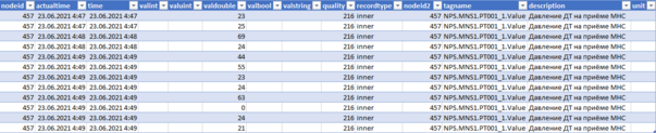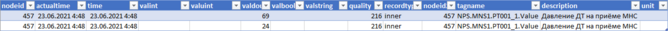 Результат запроса в MS Excel (текущее значение сигнала отображается в столбце "valuint"):
