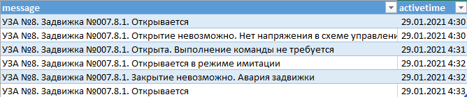 7. Для получения истории изменений состояний всех задвижек узла "UZA12 НПС" создайте запрос с выборкой по столбцам "Время возникновения события", "Имя сигнала" и "Сообщение":