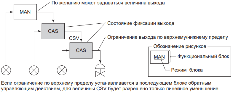 Значение задания SV вторичного контура отслеживает движение выходного значения главного контура MV, если движение совершается в направлении снятия фиксации, и не отслеживает значение MV главного контура, а сохраняет текущее значение, если движение совершается в направлении фиксации.