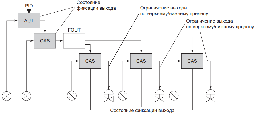 Даже в случае, когда ряд функциональных блоков подсоединяются на последующем уровне через блок распределения сигнала при каскадном управлении FOUT, состояние фиксации выхода функционального блока последующего уровня передается функциональному блоку предыдущего уровня через блок FOUT.