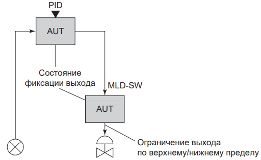 При состоянии AUT ПИД регулятора и ручного загрузчика с переключением авто/ручной MLD_SW, установите управляющий выход MV ПИД регулятора на 0%, тогда управляющий выход ручного загрузчика MV установится на 0%, зафиксированный на нижнем пределе, изменяя, таким образом, состояние данных управляющего выхода MV на CLP-. Это также приведет к установлению состояния данных управляющего выхода ПИД регулятора на CLP- и ограничит изменения управляющего выхода MV ПИД регулятора в направлении фиксированного выхода. Ограничение ПИД регулятора будет продолжаться до тех пор, пока изменение выхода ПИД регулятора не вызовет изменения управляющего выхода MV блока MLD_SW, превышающее 2%, снимая, тем самым, состояние данных CLP- управляющего выхода MV.