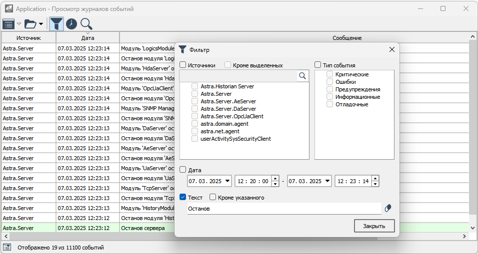 Фильтрация по тексту позволяет отобразить события в системных журналах, в сообщении которых присутствует текст, введенный пользователем.