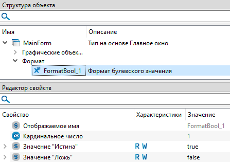 Компонент служит для представления логических значений (true/false) в альтернативном виде. Компонент не визуальный и виден только в области Структура объекта. На рисунке ниже показано, как на форму был добавлен компонент Формат булевского значения.