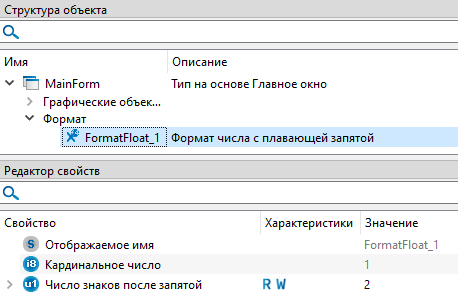 Компонент служит для представления чисел с плавающей точкой с нужной точностью. Компонент не визуальный и виден только в области Структура объекта. На рисунке ниже показано, как на форму был добавлен компонент Формат числа с плавающей запятой.