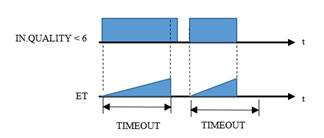 Если качество сигнала в течение интервала времени TIMEOUT остается плохим, алгоритм заменяет качество выхода OUT на качество входа IN. При ET >=TIMEOUT заморозка прекращается. Тем самым алгоритм откладывает формирование другими алгоритмами ошибок, связанных с плохим качеством данных на входе IN.