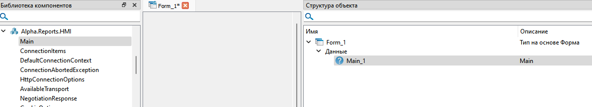 Для использования данных функций необходимо добавить на форму в раздел "Данные" объект "Main" из добавленной библиотеки "Alpha.Reports.HMI".
