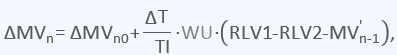 Значения, считанные с адресатов соединений через клеммы RL1 и RL2, используются как сигналы сброса RLV1, RLV2. Сигналы сброса RLV1, RLV2 используются для выполнения приведенного ниже корректирующего вычисления с выходным значением ПИД-вычисления (∆MVn0). Таким образом, когда выходное значение MV ограничено заданными верхним и нижним пределами управляющего выхода (MH, ML), ограничение сброса влияет непосредственно на интегральную составляющую выходной величины MV’, предшествующей MV в расчете.