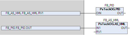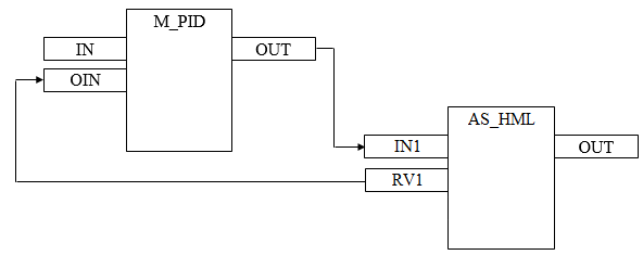 На данной схеме функция возврата выхода селектора AS_HML, находящегося в режиме автовыбора (SW = 4), совместно с функцией ограничения сброса вышестоящих ПИД-регуляторов (M_PID) позволяет невыбранным ПИД-регуляторам отслеживать выходное значение селектора, что обеспечивает безударный переход в случае их переключения.