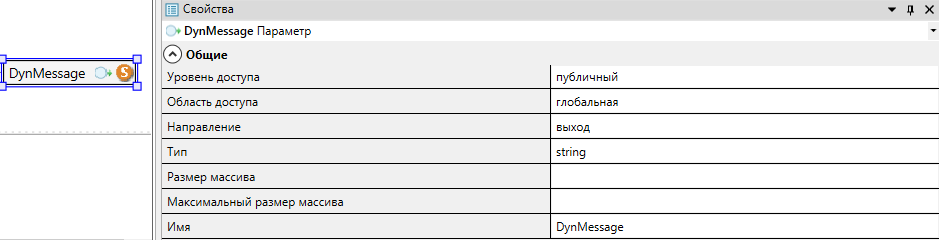 Создайте параметр типа STRING, значение которого будет являться текстом сообщения. Для этого из панели инструментов перенесите параметр нужного типа в рабочую область. В свойствах укажите направление выход. Назовите параметр DynMessage (название используется в качестве примера).