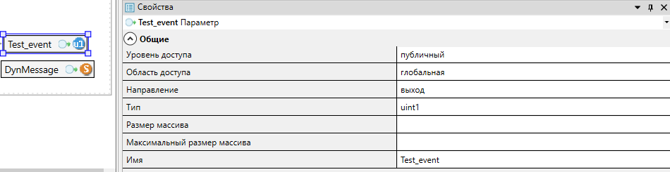 Создайте параметр, значение которого будет являться причиной изменения динамического сообщения. Для этого из панели инструментов перенесите параметр нужного типа в рабочую область. В свойствах укажите направление выход. Назовите параметр Test_event (название используется в качестве примера).