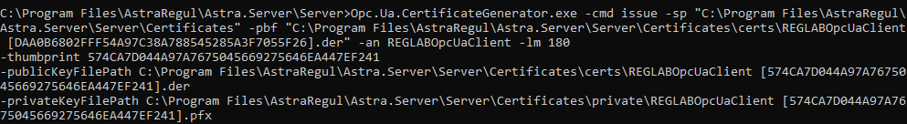 Сертификаты OpcUaClient можно сгенерировать из командной строки с помощью Opc.Ua.CertificateGenerator.exe