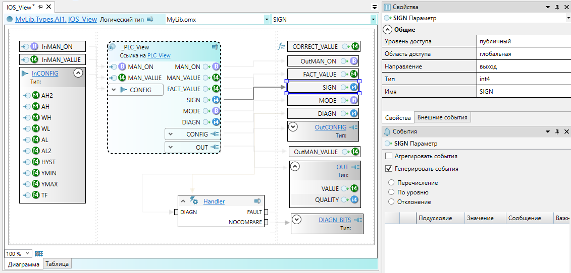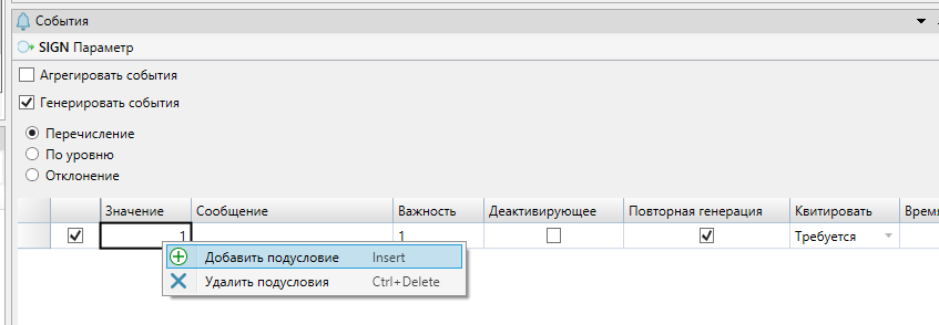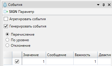 1. Выберите параметр "SIGN", при изменении значений которого будут генерироваться события, и в окне "События" установите флаг "Генерировать события".