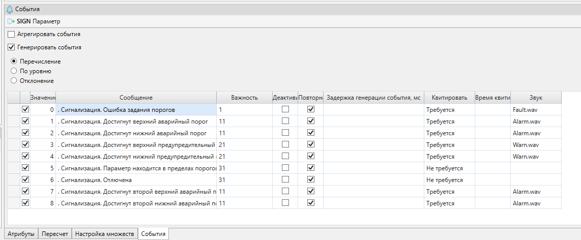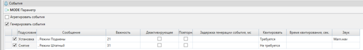 После настройки генерации событий у сигнала появится атрибут "События", значение которого будет содержать настроенные параметры генерации.