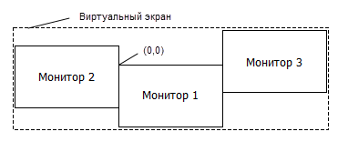 Первый монитор в операционной системе содержит начало координат (0,0).