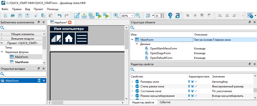 Чтобы главная экранная форма открывалась на весь экрана, откройте редактор свойств экранной формы "MainForm" и задайте следующие свойства: