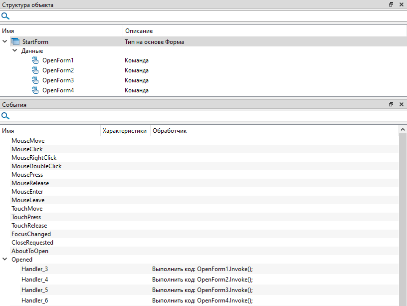 3. Для экранной формы "StartForm" добавлены команды и обработчики событий для открытия до четырех главных экранных форм при работе в многомониторном режиме.