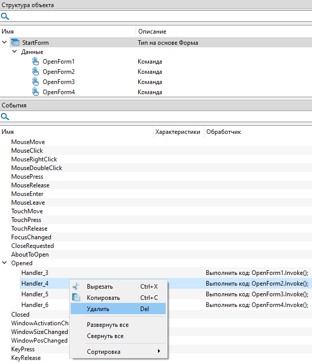 4. Каждый обработчик события открывает Главную экранную форму в новом окне. При использовании одномониторной системы оставьте только один обработчик событий, удалив оставшиеся через контекстное меню.