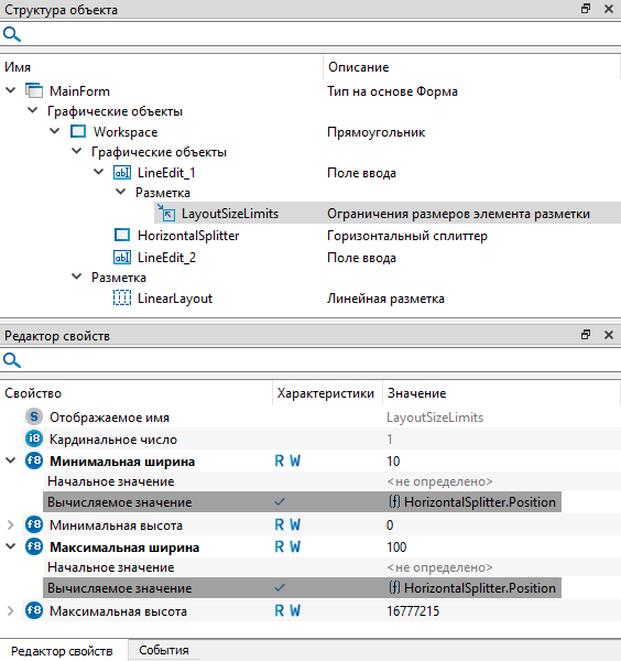 3. К объекту, расположенному слева (Область 1), примените инструмент Ограничения размеров элемента разметки. Укажите в нем в качестве вычисляемых значений минимальной и максимальной ширины положение горизонтального сплиттера.