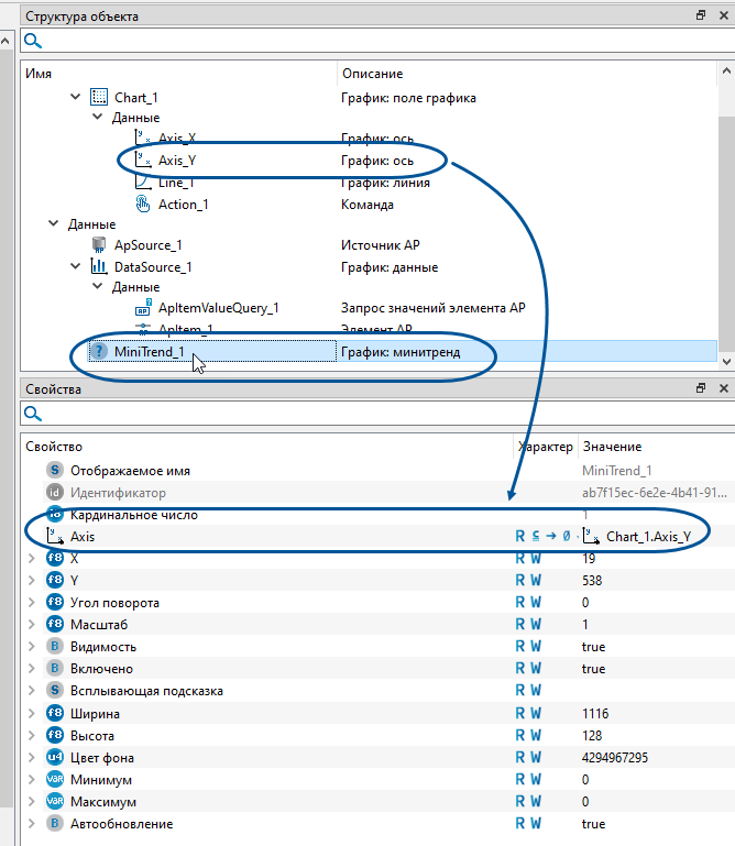 Если в проекте используется несколько трендовых полей, удобно указывать какая ось отображается на минитренде в скрипте через функцию SetAxisByld. Для использования функции нужно знать id оси. Получить ID оси можно через функцию GetID экземпляра типа График: ось.