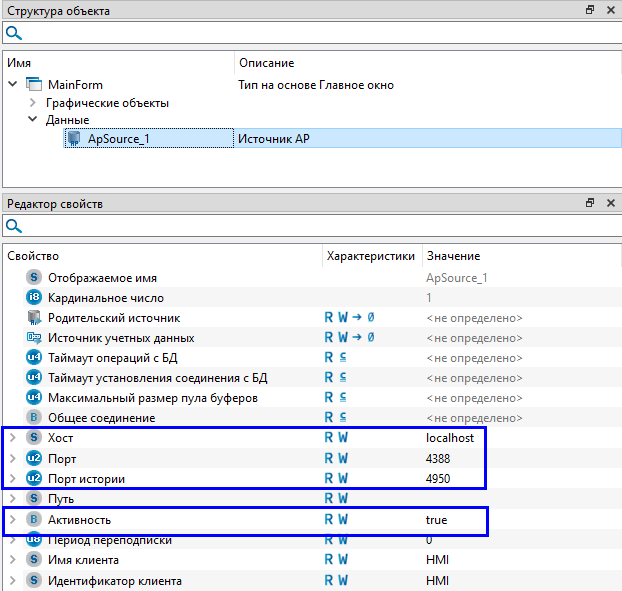 1. Добавьте компонент Источник AP. Задайте значения в свойствах Хост, Порт, Порт истории (если планируете запрашивать исторические значения), Активность.