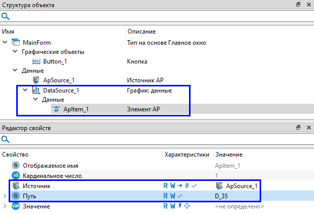 3. Добавьте компонент Элемент AP дочерним компоненту График: данные. Укажите источник данных в свойстве Источник и привяжите компонент к сигналу в свойстве Путь.