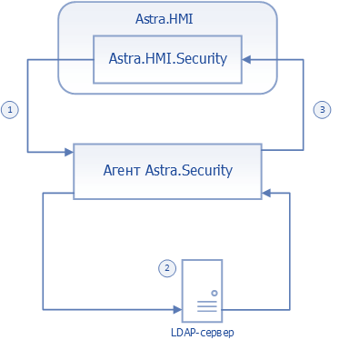 Компоненты расширения Astra.HMI.Security обращаются к подсистеме безопасности Astra.Security с помощью API (свойств, функций и событий).