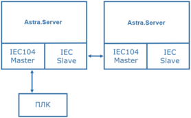 Работая в составе Astra.Server, станция МЭК 60870-5-104 реализует подчиненную станцию: получает данные со станций при изменении значения параметра и передает полученные данные Мастеру (опросчику), а также выполняет команды, пришедшие от активного Мастера (опросчика). Полученные данные через интерфейсы ядра сохраняются в оперативную базу данных (ОБД). Ядро сервера при получении изменившихся сигналов уведомляет о них другие модули, которые обслуживают эти сигналы, в том числе и модуль OPC DA Server. Он в свою очередь передает данные клиентам, подписанным на изменившиеся сигналы.
