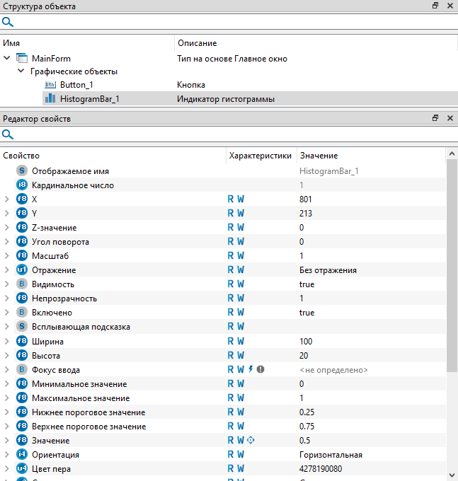Компонент Индикатор гистограммы применяется на мнемосхемах для демонстрации значений некоторых динамических параметров, у которых есть нижнее и верхнее пороговое значение. Текущее значение индикатора гистограммы определяется свойством Значение.