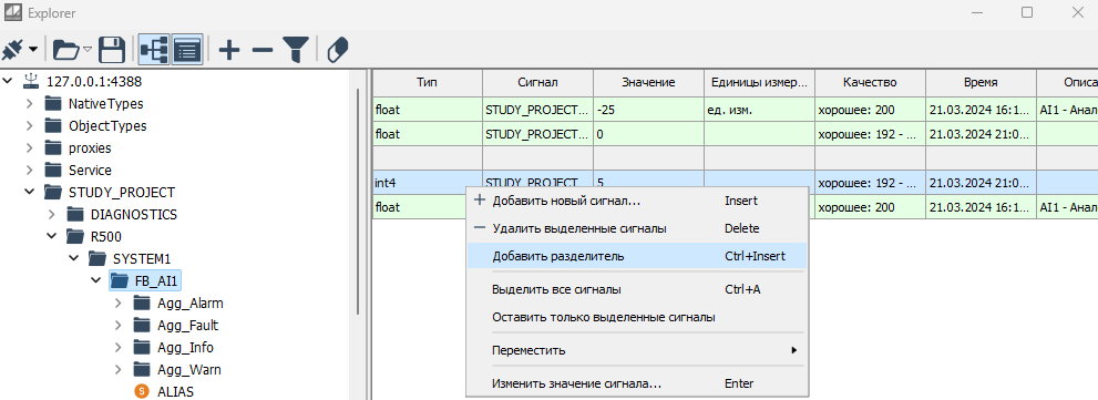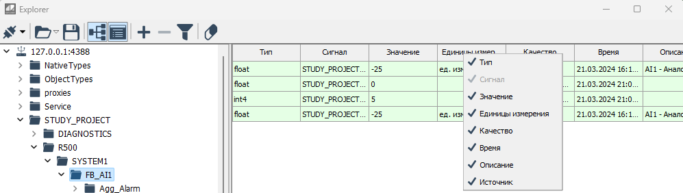 Столбцы таблицы инспектора сигналов можно показать или скрыть. Для этого щелкните ПКМ на заголовке таблицы и в выпадающем списке отметьте нужные столбцы.