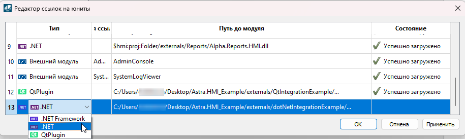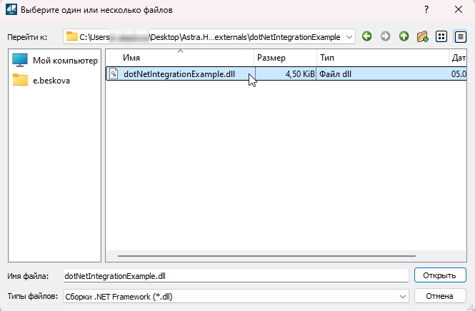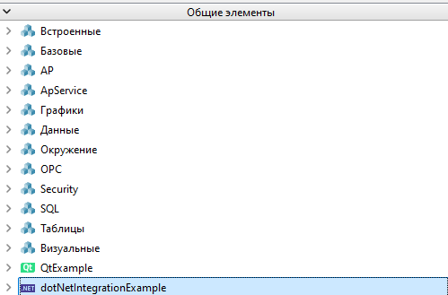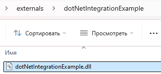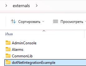Пример интеграции .Net Core представлен в проекте Astra.HMI_Example. Исходный код находится в директории "dotNetIntegrationExample" в директории проекта. Собранный файл модуля .dll находится по пути "externals\dotNetIntegrationExample".