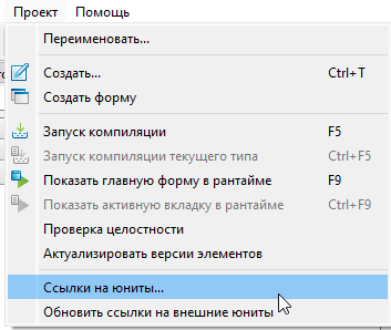 2. Откройте проект Astra.HMI. Перейдите на вкладку "Проект" и выберите "Ссылка на юниты...".