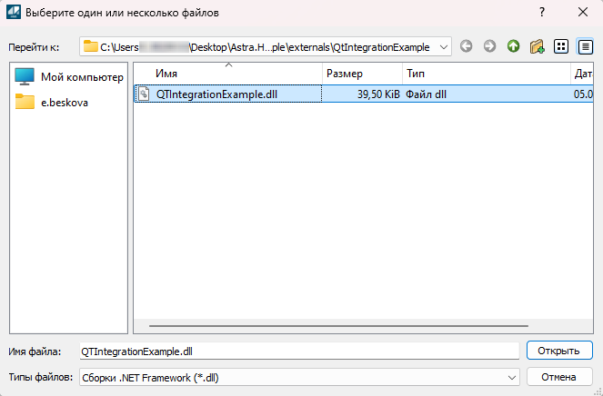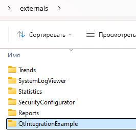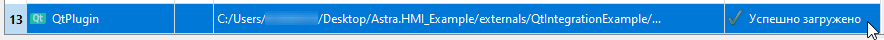 Пример интеграции QtPlugin представлен в проекте Astra.HMI_Example. Исходный код находится в директории "QTIntegrationExample" в директории проекта. Собранный файл модуля .dll и .so находятся по пути "externals\QTIntegrationExample\".