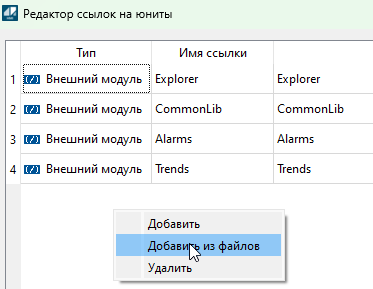 2. Откройте проект Astra.HMI. Перейдите на вкладку "Проект" и выберите "Ссылка на юниты...".