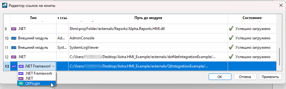5. В параметре "Тип" выберите "QtPlugin" и нажмите кнопку "Применить".