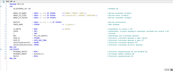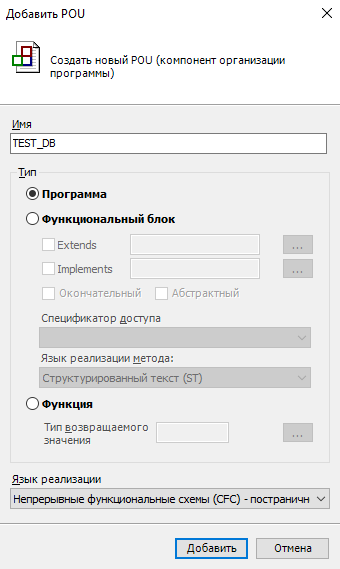 1. Создайте POU типа "Программа" на языке "CFC - постранично" и назовите его "TEST_DB".
