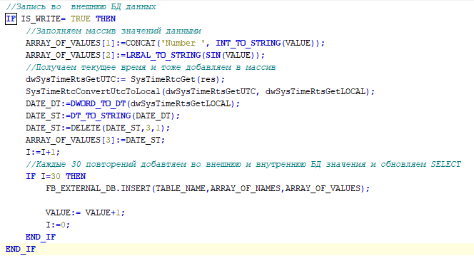 Ниже приведена логика действия, которое добавляет в столбец "NAME" значение "Number <номер итерации>", в столбец "VALUE" – синус от номера итерации, а в столбец "DATE" – текущую дату и время.
