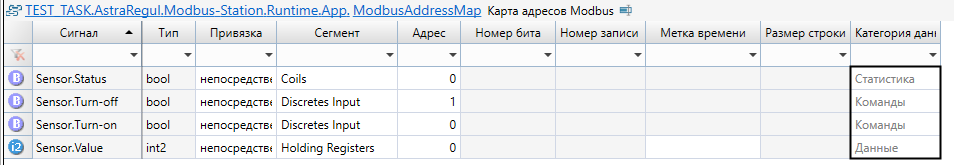 При переходе в карту адресов в столбце "Категория данных" для каждого сигнала будет показано значение атрибута. Значение можно переопределить в карте адресов.