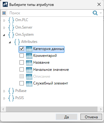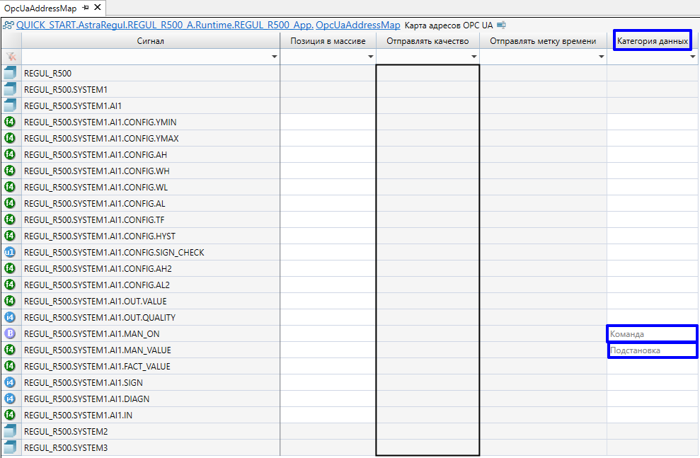 При переходе в карту адресов в столбце "Категория данных" для каждого сигнала будет показано значение атрибута. Значение можно переопределить в карте адресов.
