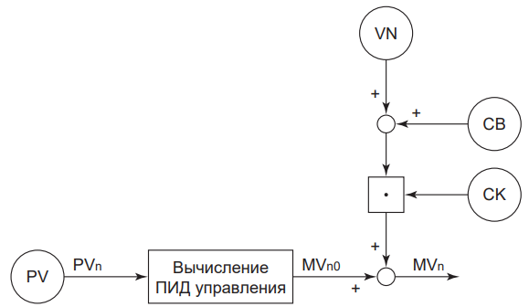 Компенсация выхода представляет собой управляющее воздействие, состоящее в добавлении величины скомпенсированного входа/выхода VN, получаемой извне, к выходному сигналу расчета ПИД-управляющего воздействия.