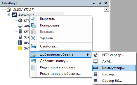 1. Добавьте новый объект "Коммутатор", для этого нажмите правой кнопкой мыши по объекту "AstraRegul" и выберите "Коммутатор..." в меню "Добавление объекта...".